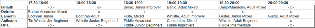 All classes take place on Monday evenings in Donabate Portrane Educate Together National School. Term 1 runs from approximately September to January and Term 2 runs from approximately January to May. Each term consists of 12 classes, with one or two classes per term reserved for slow sessions at the school. These sessions involve students from all classes. They are a nice introduction to playing in a group and a great way to get to know other students.